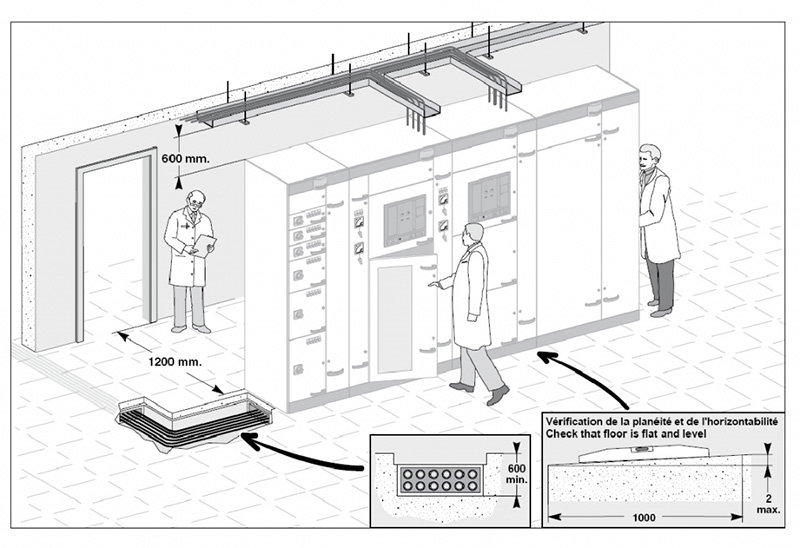 Phía mặt trước tủ nên để khoảng trống ít nhất 1200mm (hoặc 1600mm cho tủ 6300A) để có thể mở được cửa, có không gian thực hiện việc bảo dưỡng tủ hoặc khi cần thiết có thể sử dụng thiết bị nâng. Để khoảng trống dự phòng cho việc mở rộng tủ về sau.